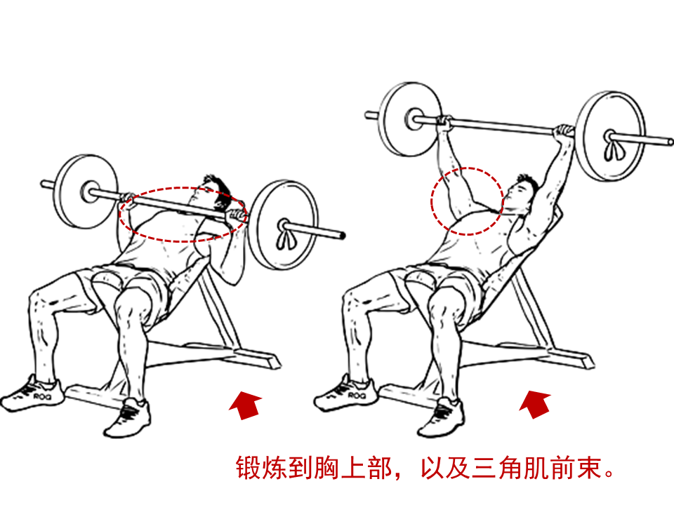 动作1:杠铃上斜卧推(上胸,也会锻炼到三角肌前束)