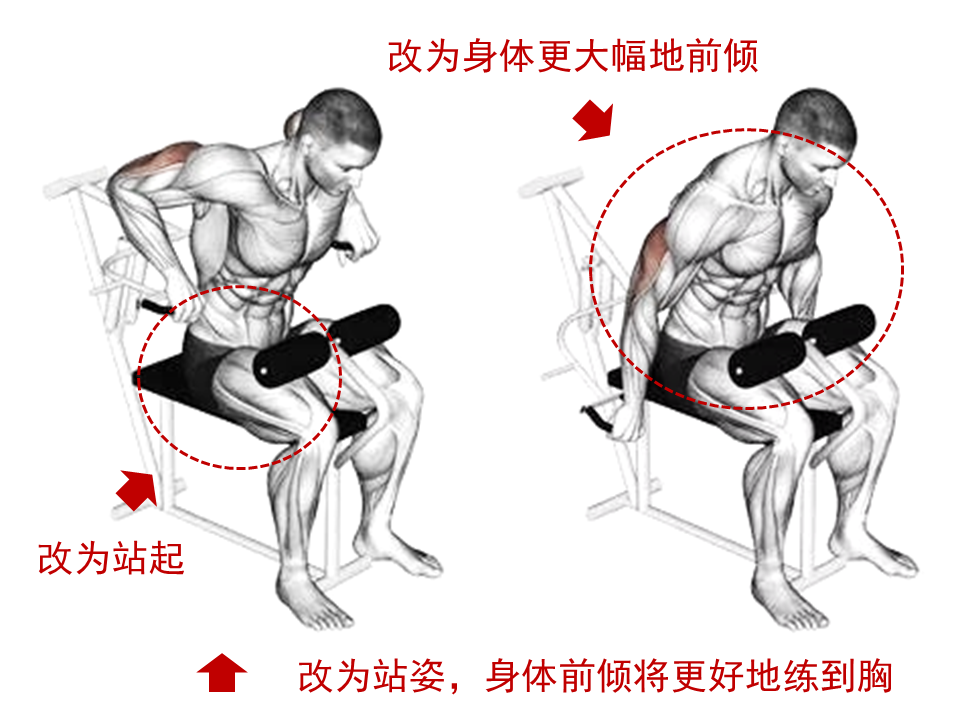 (1)角度越大,上身越接近垂直地面,胸上部和三头肌所受到的刺激越大。不过完全坐直后,就变成推肩了。