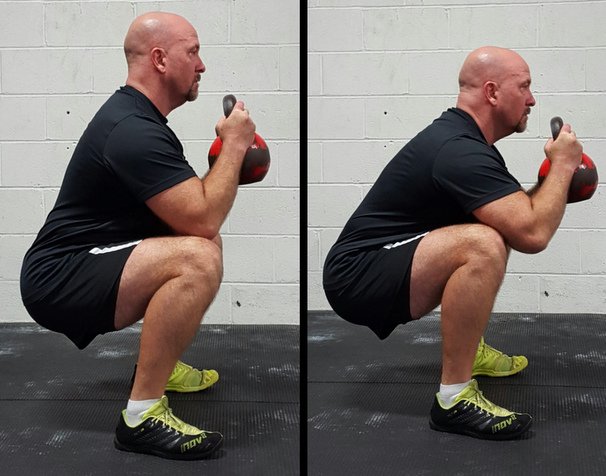 进行高脚杯深蹲时,同样的收紧你的核心,背与胸脊保持直立,另外很重要的一点就是在蹲下时,你的手肘位置会与膝盖垂直,如 上图左方所示,而非上图右方。