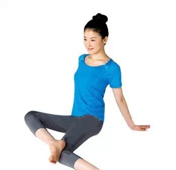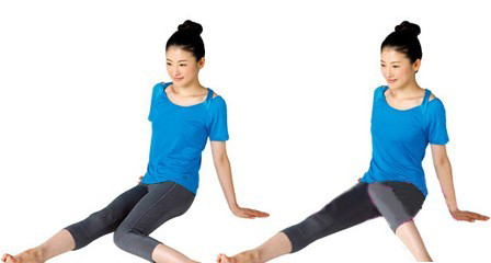 2. 将左膝弯曲90度,膝盖向内,小腿平摆于左侧,用小腿与左脚内侧着地,上身微微转向,令重心往右移动。